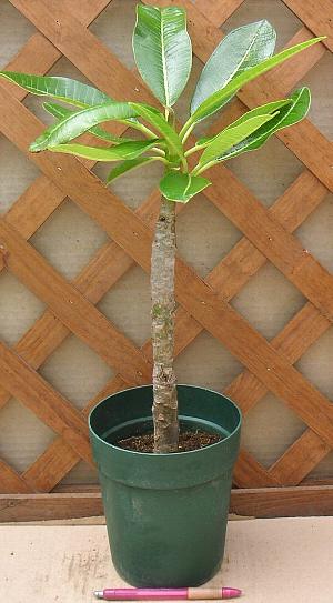 オブツサ種は、肉厚で光沢のある葉が特徴で、香りのよい白い花を咲かせる、人気のプルメリアです。