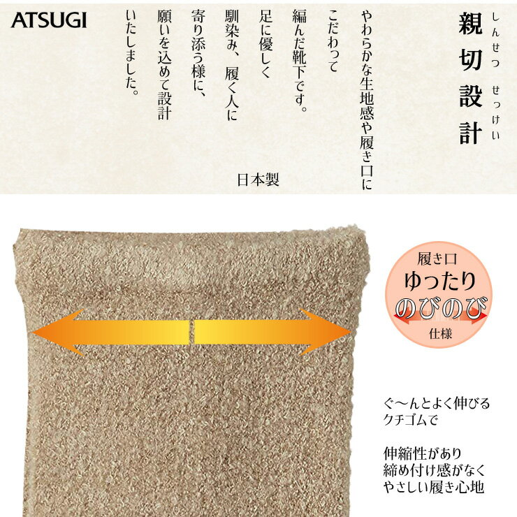 素材 アクリル、ナイロン、ポリエステル、ポリウレタン サイズ 24cm丈(※男女兼用) 特徴 アツギ・親切設計 やわらかな生地感や履き口にこだわって編んだ靴下ブランドです。