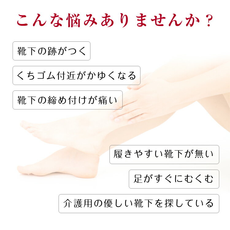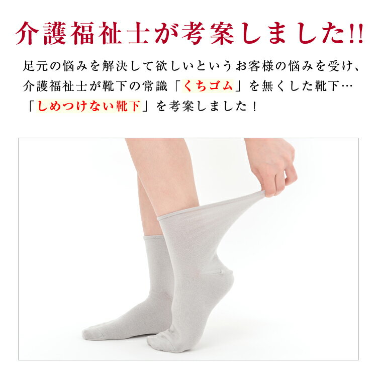 口ゴムが無く締め付けないので、むくんだ足でもゴム跡が付きにくいのが特徴。