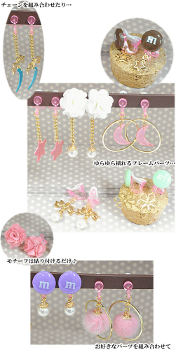 円盤部分や、カンの部分にお好きなパーツをつけて、オリジナルのイヤリング作りに。